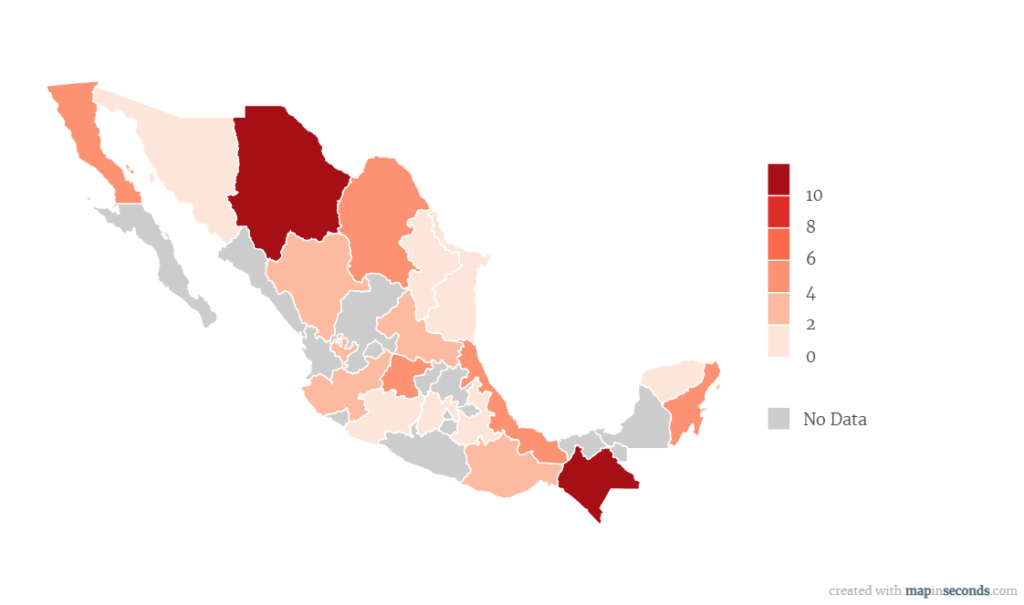 Mapa 1. Distribución geográfica de hechos que reportaron algún tipo de violencia cometida en contra de personas migrantes en tránsito por México, en 2025.