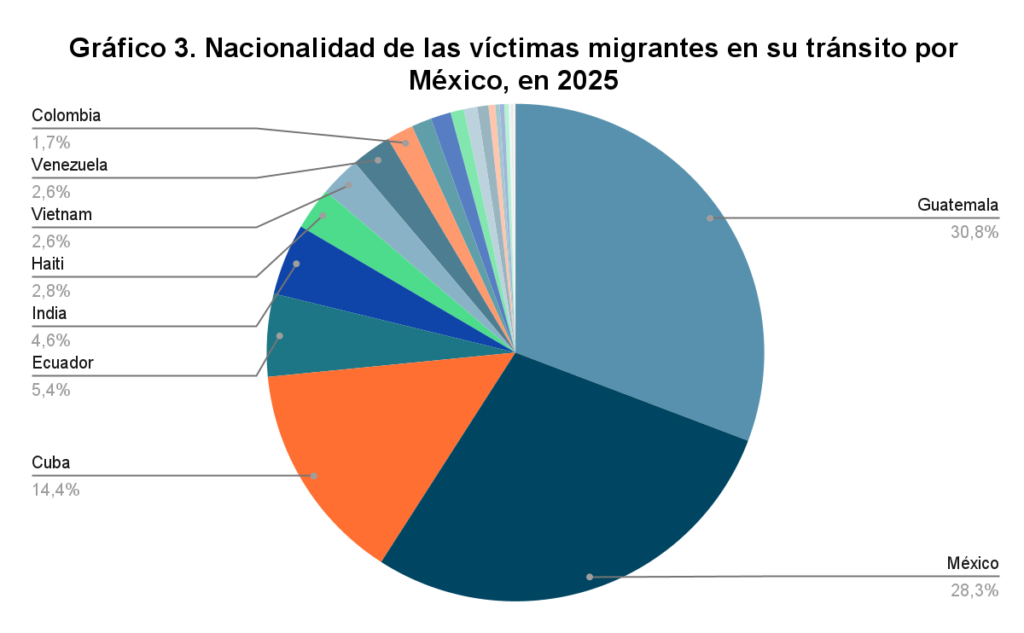 Entre el 1° de enero y el 15 de diciembre de 2025, se registraron, al menos, 98 notas periodísticas con 1,171 víctimas. De éstas sólo se pudo identificar a 342 víctimas de las cuales 139 (40.6%) son mujeres, 157 (45.9%) son hombres y 46 (13%.4%) son niños, niñas y adolescentes. En el resto de las víctimas no fue posible identificar su sexo o edad, debido a que la nota no lo mencionaba. El mes con mayor número de registros de víctimas ha sido septiembre (379), debido a tres hechos en los que se encontraron tráileres con más de 100 migrantes en situación de hacinamiento y abandono.