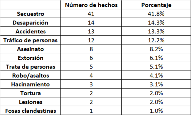 En cuanto a las violencias cometidas contra las personas migrantes en tránsito por México, del total de hechos identificados en las notas (98), 41.8% reportaron la comisión de secuestros, 14.3% la desaparición de migrantes, 13.3% la ocurrencia de accidentes, 12.2% refirieron el delito de tráfico de personas y 8.2% mencionaron el asesinato de alguna persona migrante.