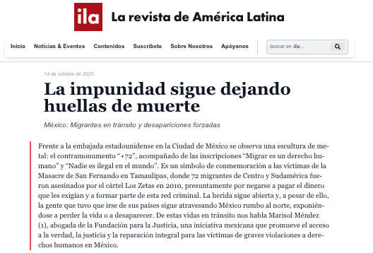 La herida sigue abierta y, a pesar de ello, la gente que tuvo que irse de sus países sigue atravesando México rumbo al norte, exponiéndose a perder la vida o a desaparecer. De estas vidas en tránsito nos habla Marisol Méndez (1), abogada de la Fundación para la Justicia, una iniciativa mexicana que promueve el acceso a la verdad, la justicia y la reparación integral para las víctimas de graves violaciones a derechos humanos en México.