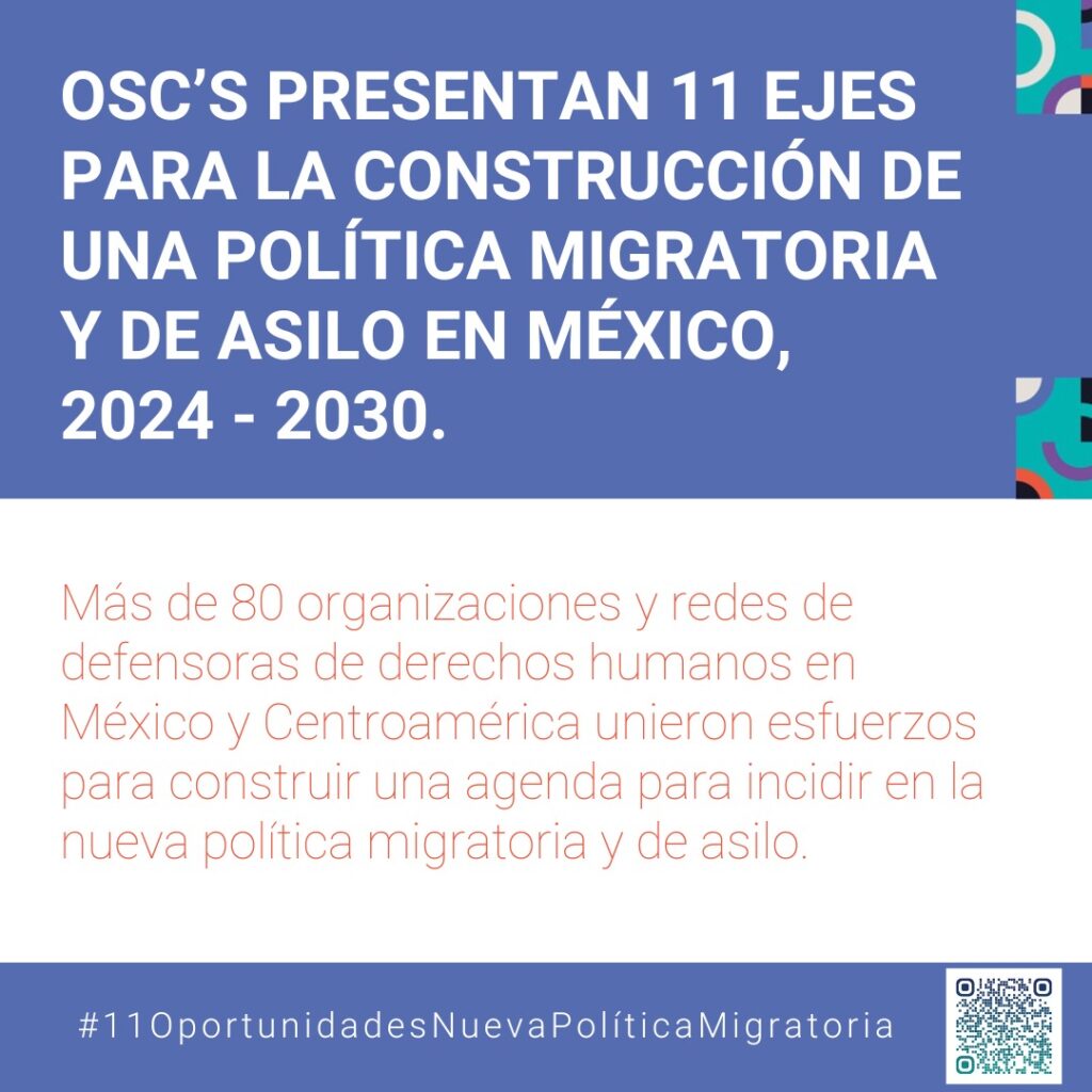 Organizaciones, redes, activistas, defensoras y acompañantes de la población en situación de movilidad humana en México lanzamos la iniciativa “11 ejes para una nueva política migratoria y de asilo, 2024 – 2030”, un esfuerzo que busca generar un consenso entre las fuerzas políticas, sociales y empresariales y colocar en el centro de la agenda nacional las necesidades de las personas migrantes, solicitantes de asilo, refugiadas, apátridas, con protección complementaria, retornadas, deportadas y mexicanas residentes en el extranjero.